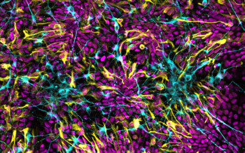 Spinal cord neural progenitors differentiated from mouse embryonic stem cells in magenta, yellow and cyan. Credit: Isabel Zhang